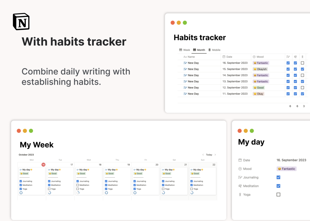 - Track your mood by leaving it with each journal entry.
