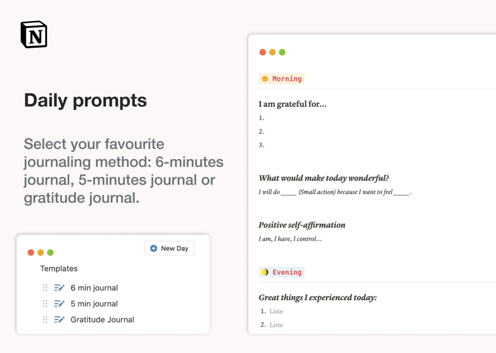 - Select your favourite journaling method: six minutes journal, five minutes journal or gratitude journal.